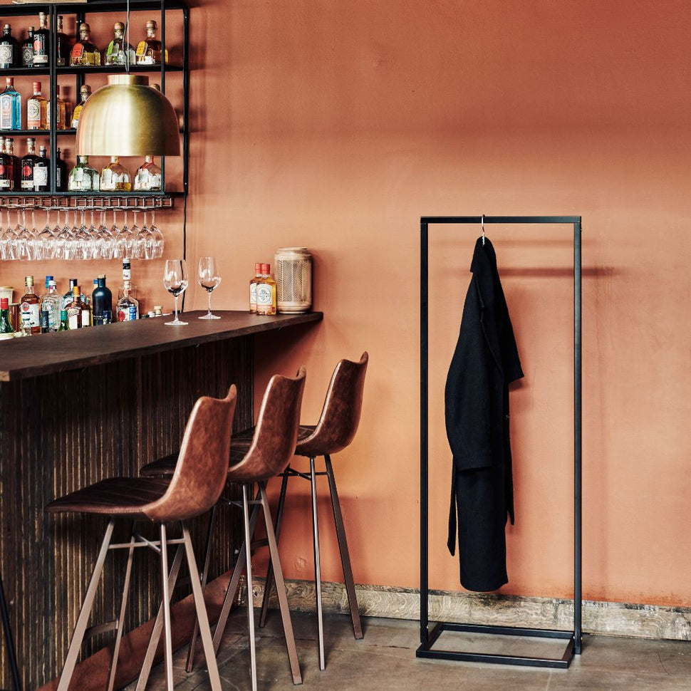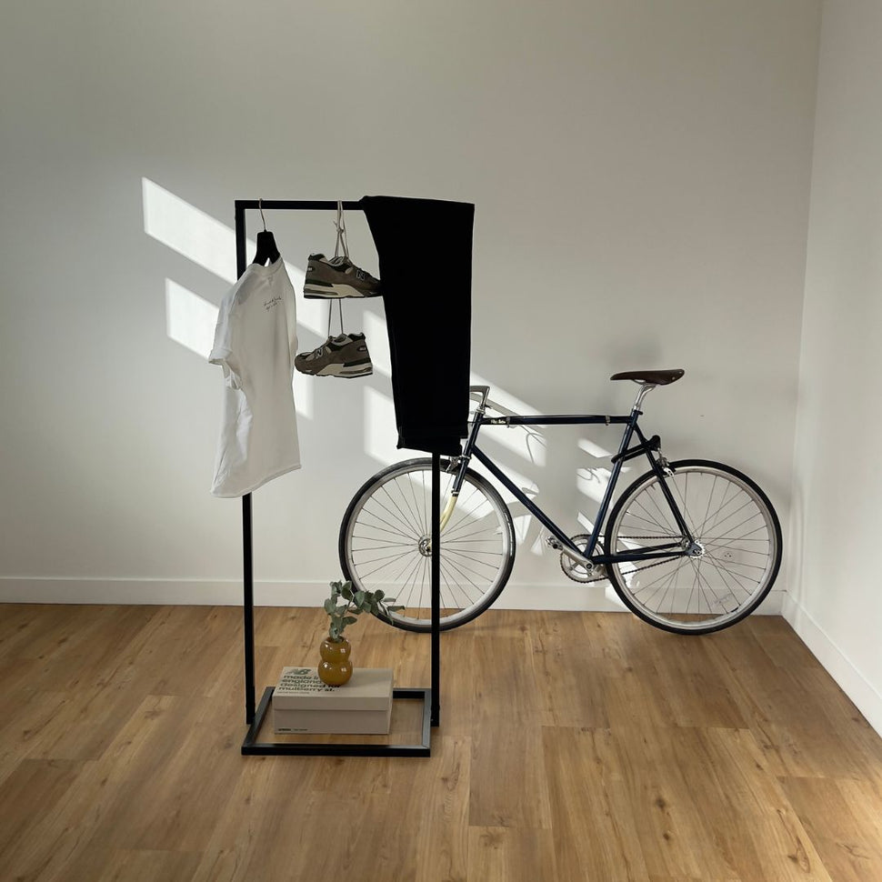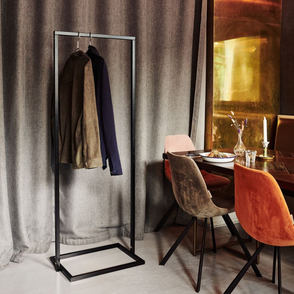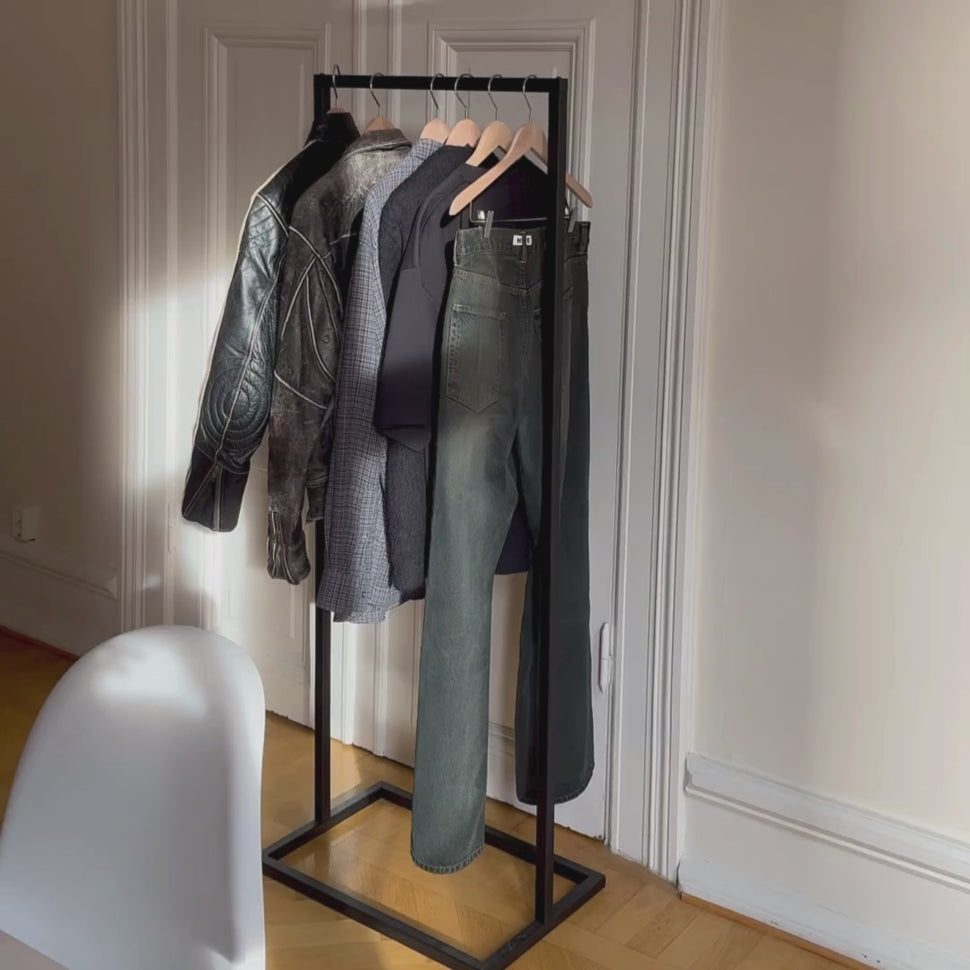 Vår klädställning i Jackson-serien är en hyllning till den skandinaviska designens rena linjer och minimalism. Tillverkad i robust, svetsat järn erbjuder den en tidlös estetik, som samtidigt är synnerligen funktionell. Den kvadratiska botten ger en stabil grund, vilket gör den perfekt för såväl walk-in-closets som mindre utrymmen där varje centimeter räknas (Läs mer om optimerade lösningar för begränsade utrymmen).