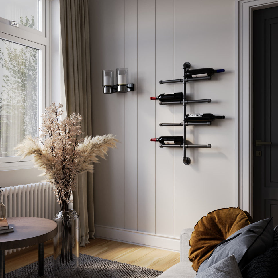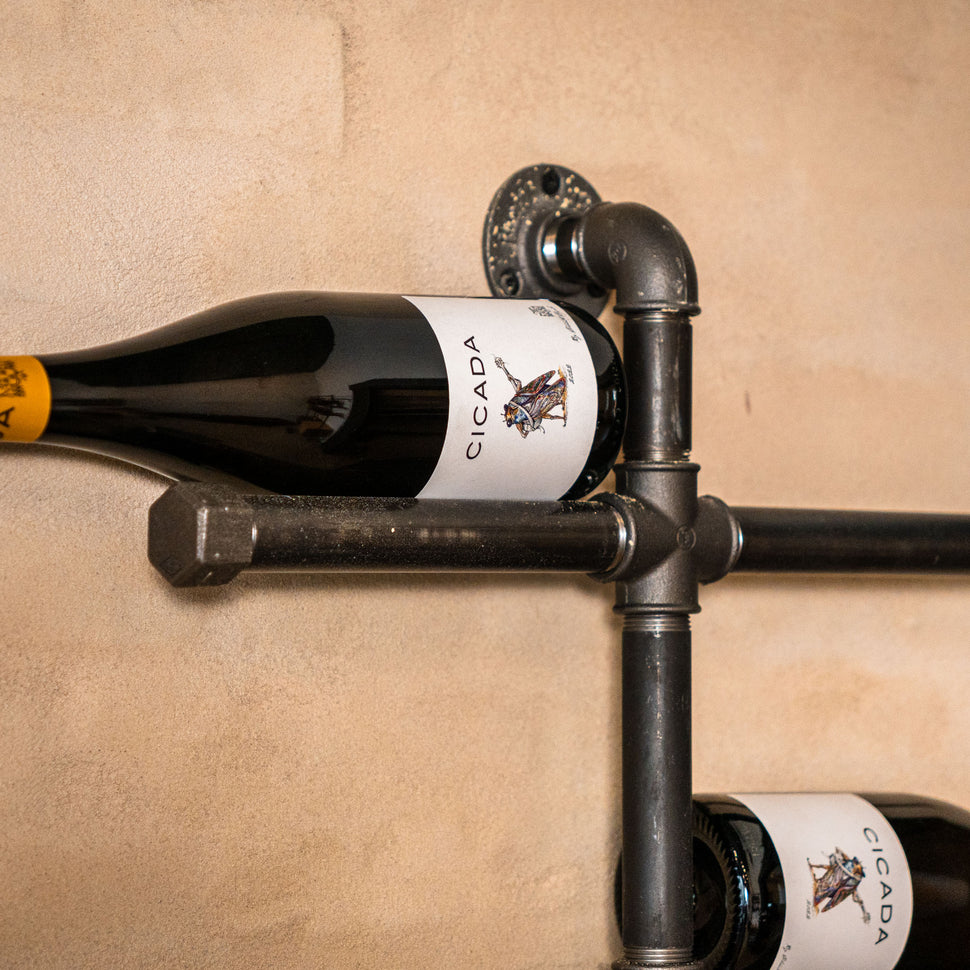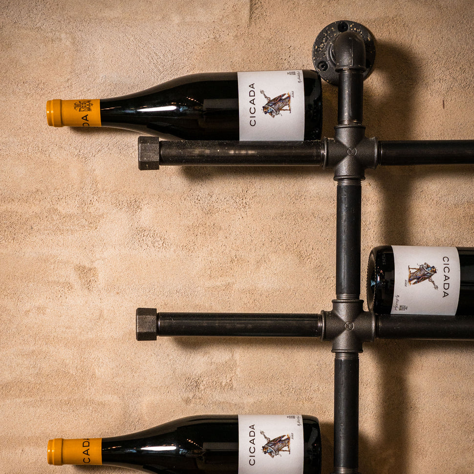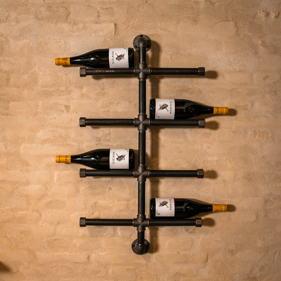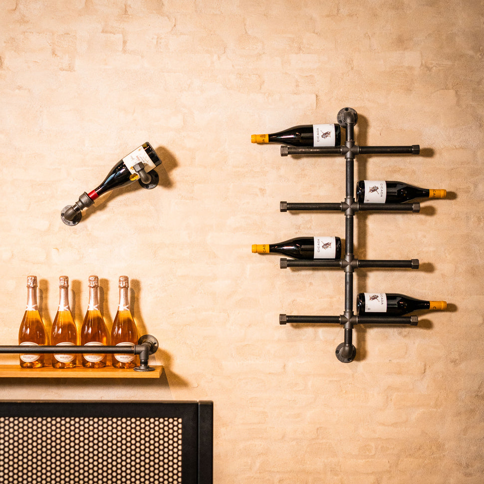 Den råa känslan av vattenrörens konstruktion mjukas upp av dess eleganta finish, vilket gör det till ett iögonfallande tillskott i vilket kök, matsal eller hemmabar som helst. Dess platsbesparande, vägghängda design säkerställer att din vinsamling förvaras utan att ta upp värdefull bänkyta eller golvyta.