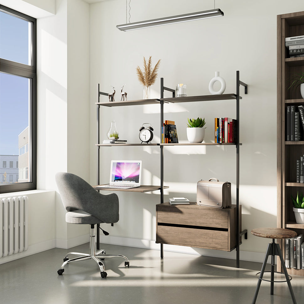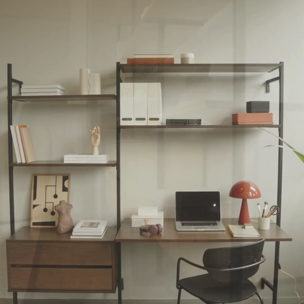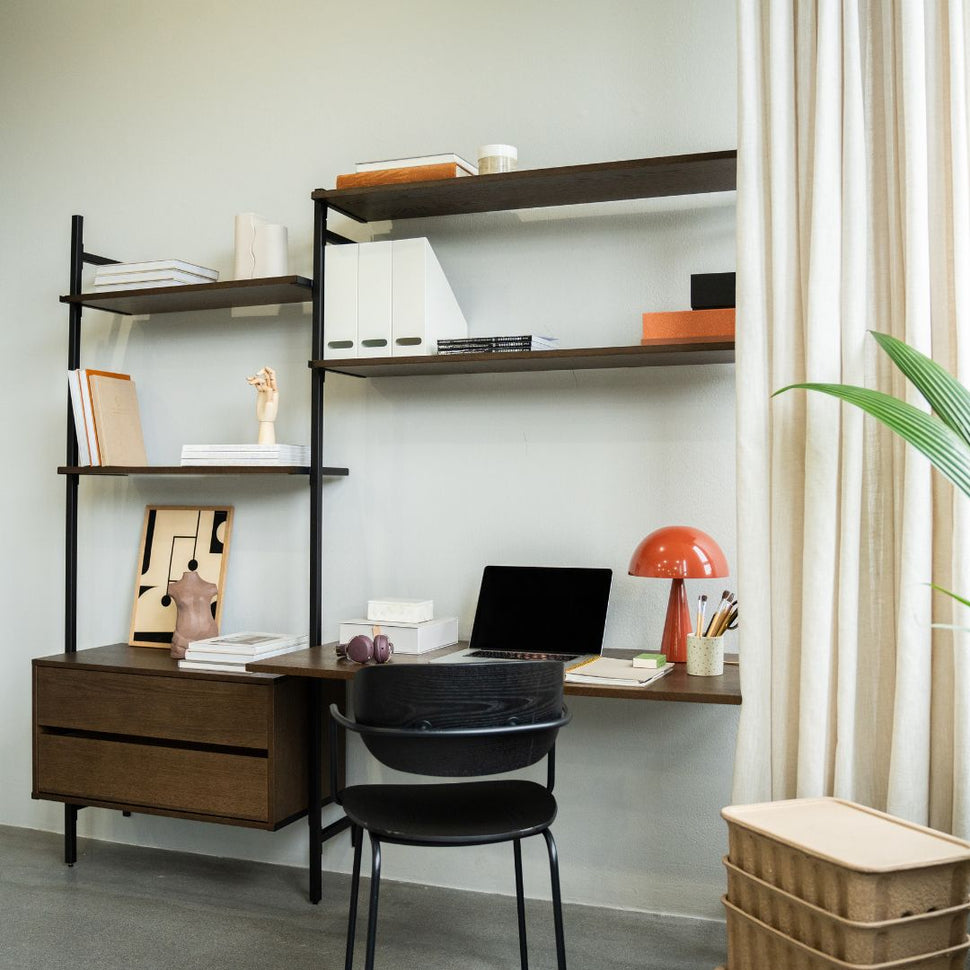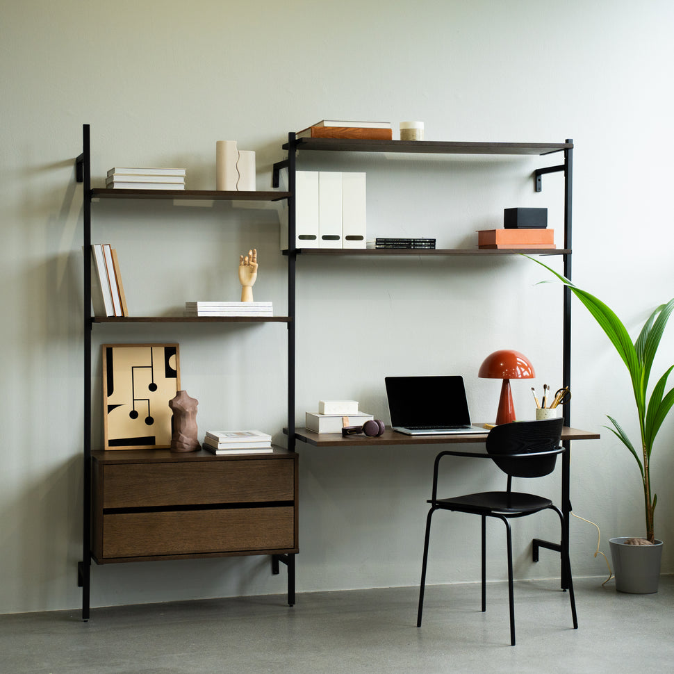 Den nätta lösningen med två sektioner får du plats med i de flesta utrymmena. Här kombineras arbetsyta med förvaringsplats på samma kvadratmeter. Du kan dessutom anpassa förvaringslösningen helt efter dina preferenser och behov. Hyllorna, byrån och skrivbordet kan du höja och sänka som du vill.