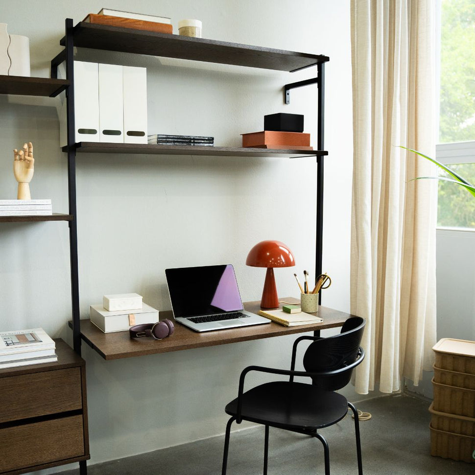 Välj mellan en ljusare, klassisk ekfanér och en mörkare, rökt variant att kombinera med hyllkonsoler i mattsvart.