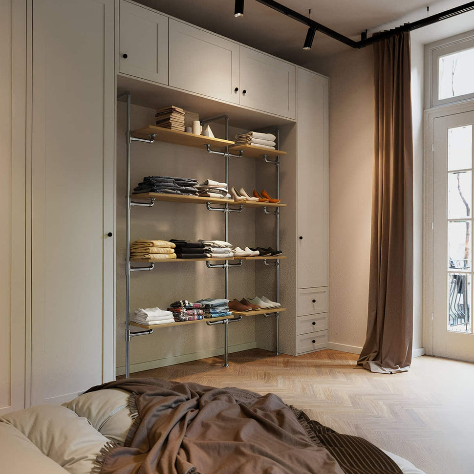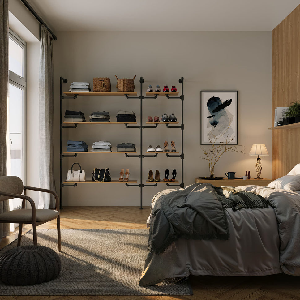 Kämpar du med begränsade utrymmen och oordning? Vi på RackBuddy förstår dina behov. Med vårt The Walk-In förvaringssystem med 2 sektioner – (4 hyllor / 4 hyllor) erbjuder vi en lösning som sträcker både din förvaring och din fantasi. Vår design kombinerar funktionalitet med skandinavisk estetik för att skapa en elegant och hållbar garderobelösning.