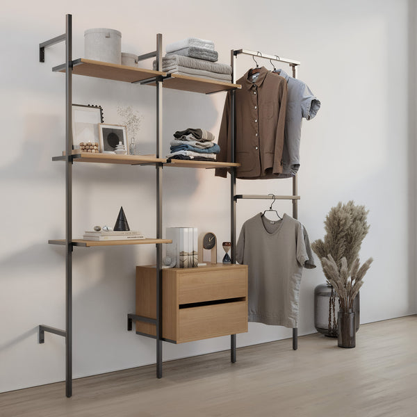 Kanske drömmer du om att kunna gömma vissa av dina saker, och i så fall kan du titta på Frame walk-in-garderobssystemet med byråer. Om du vill framhäva några av dina ägodelar, som väskor, skor eller andra accessoarer, bör du kolla in Frame walk-in-garderobssystemen med hyllor. Hyllorna och byråerna i Frame walk-in-garderobssystemen är dessutom i trä och finns i klassisk eller rökig ek.