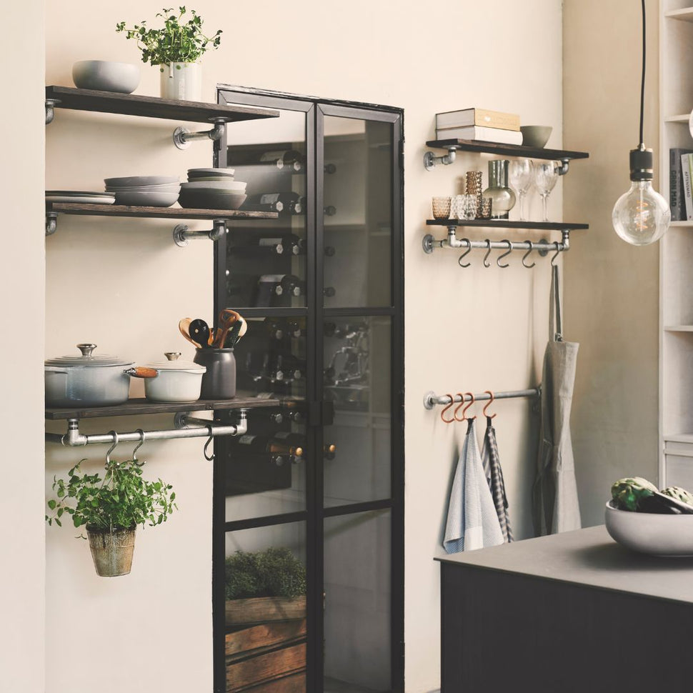 • Enkel installation: Universalskruvar och pluggar ingår i leveransen och säkerställer en snabb och färdig installation. För fler väggmonterade alternativ, se RackBuddy Cullen - Klädställning med hyllhäng för vägg.