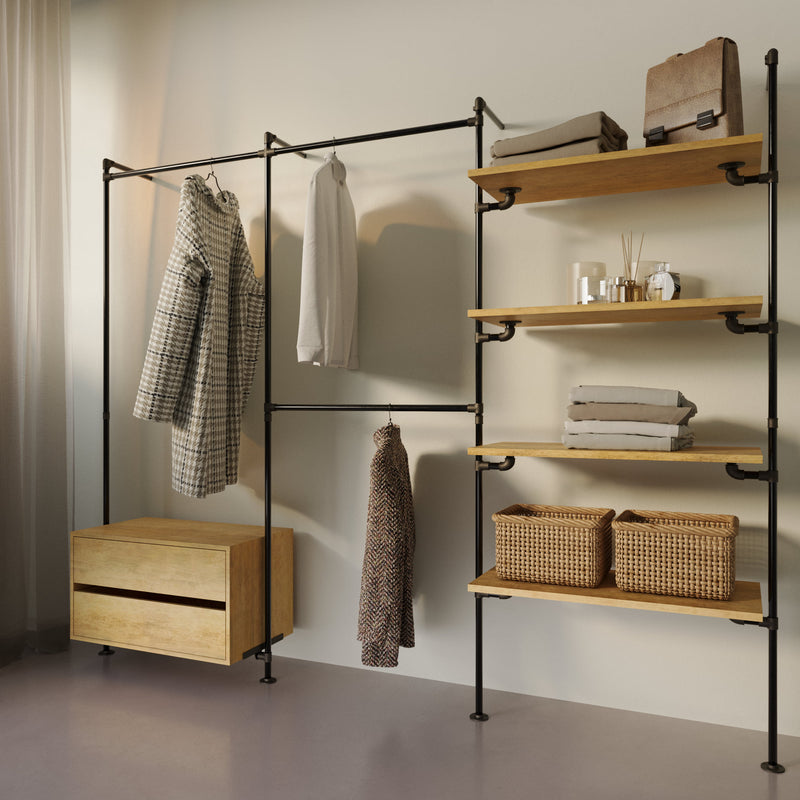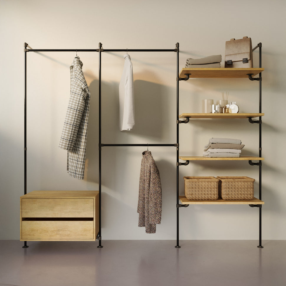 Vi på RackBuddy förstår dina behov – en stilren, praktisk och hållbar garderobelösning kan vara svår att hitta. Därför presenterar vi stolt The Walk-In förvaringssystem med 3 sektioner och byrå - (1 stång+ 1 byrå / 2 stänger / 4 hyllor). Denna unika lösning kombinerar öppen förvaring och smarta förvaringsdetaljer som optimerar ditt utrymme och förvandlar din garderob till en oas av ordning och stil. Vi har utvecklat systemet med hänsyn till flexibla behov och oändliga möjligheter – oavsett om du har en liten lägenhet eller en rymlig villa, är vår lösning skräddarsydd för dig.
